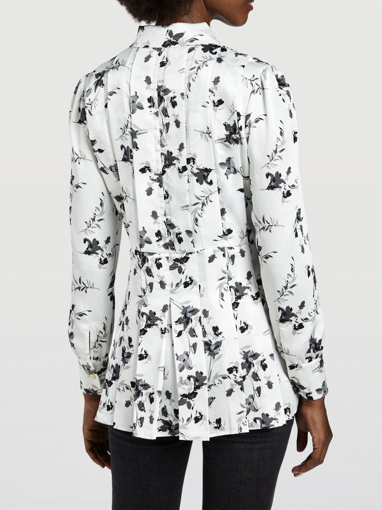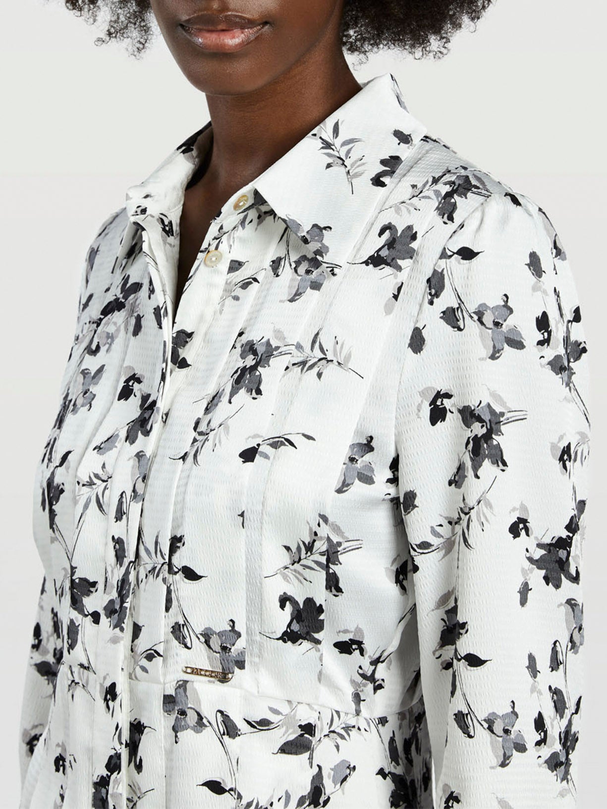 Printed pleated blouse. Features a wide collar, double placket with hidden buttons and long sleeves gathered on the top with one-button cuffs. Brand metal plate at the waist line.