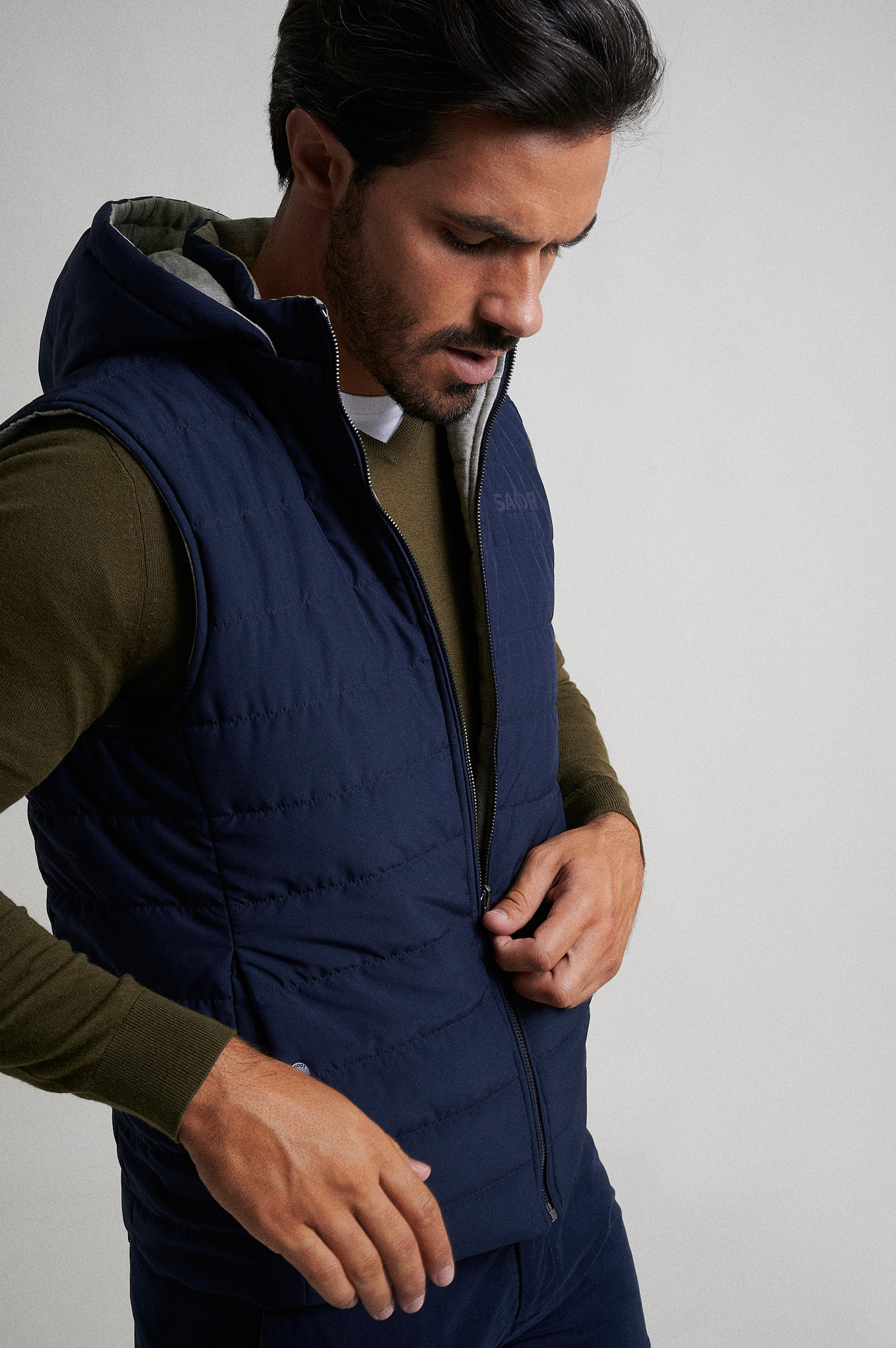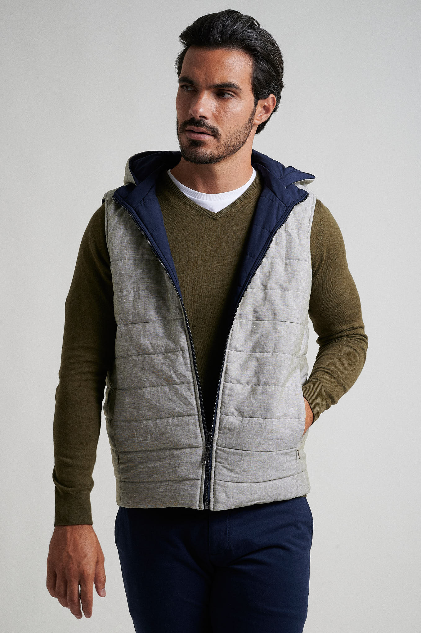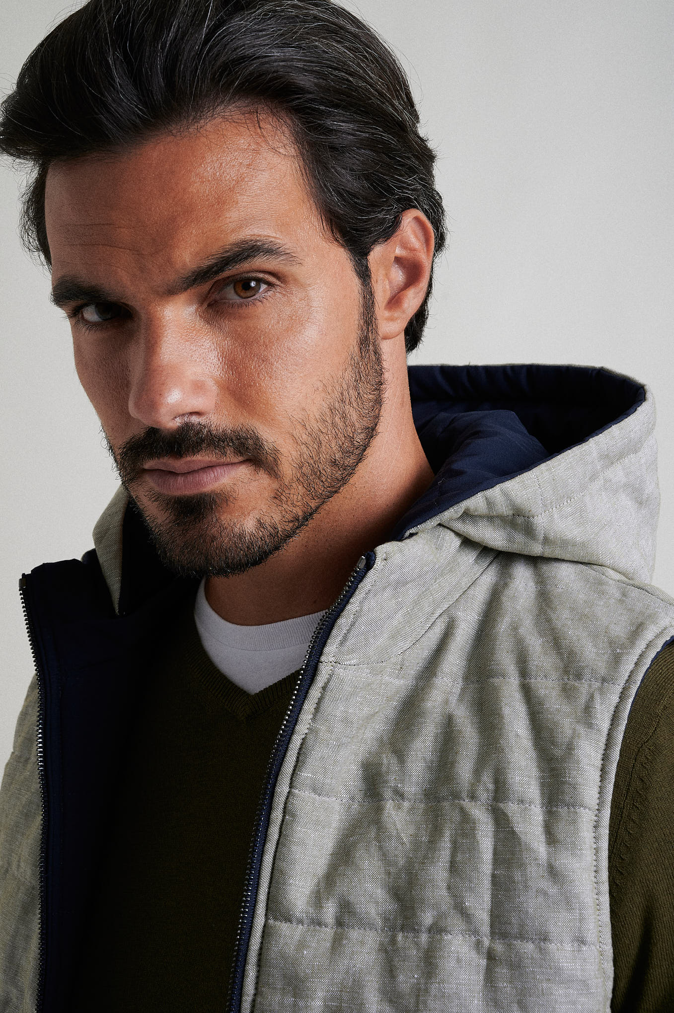 We believe true quality should never go out of fashion, which is why the main fabric of this vest is 100% recycled. Around 35 to 40 plastic bottles are recycled to produce this garment. Dark blue and khaki quilted reversible vest made of 100% recycled polyester and 58% linen 42% cotton. Removable hood. Features zipper fastening on front with personalized puller. Brand new personalized print on chest. This Respekt item is one step towards our commitment for a sustainable world.