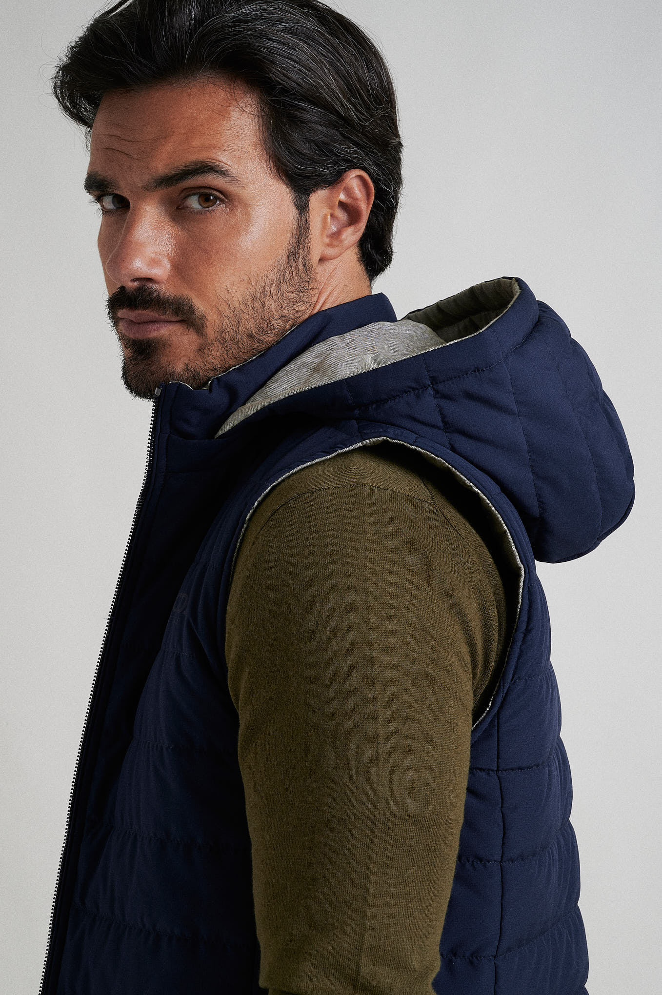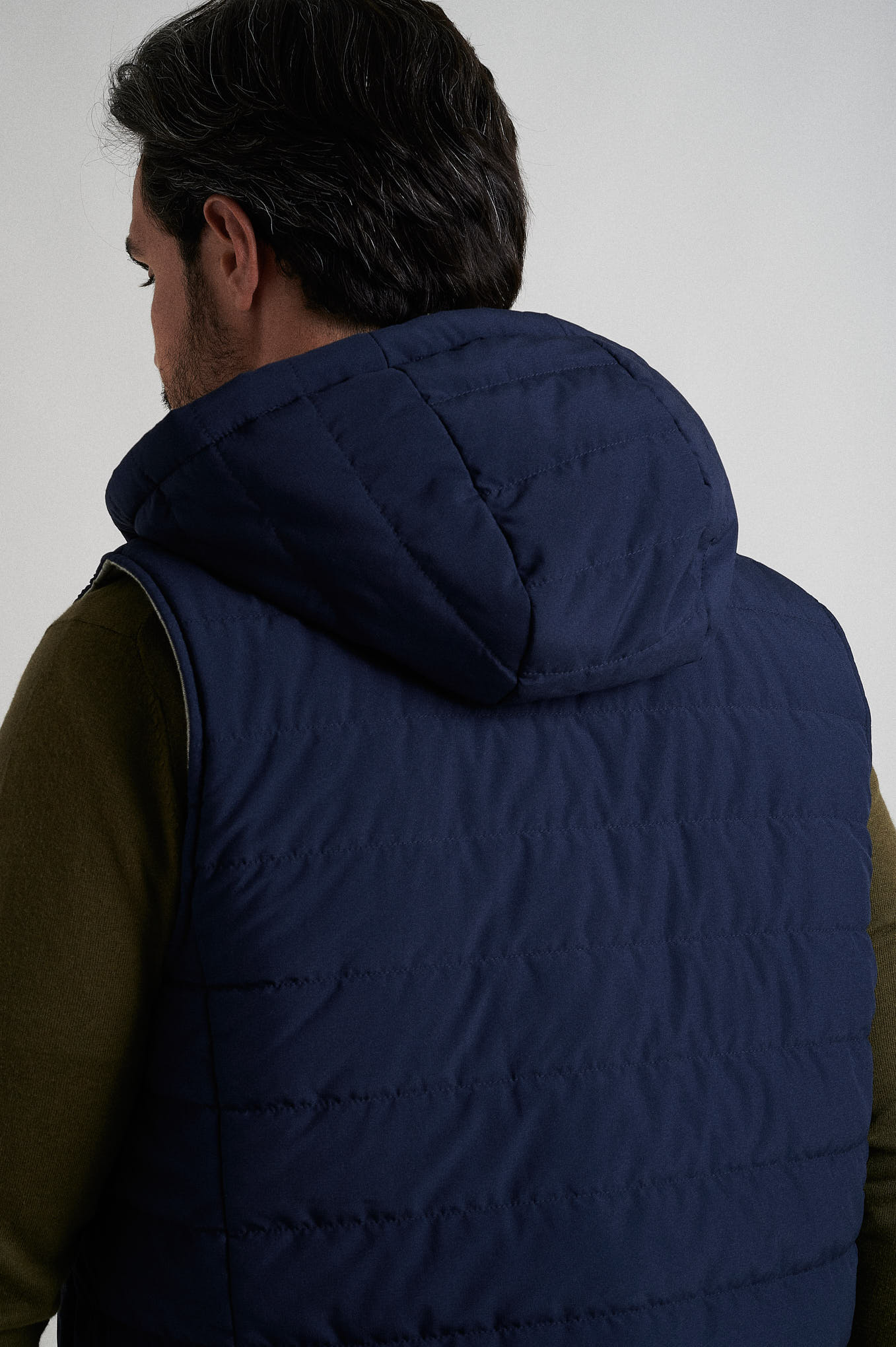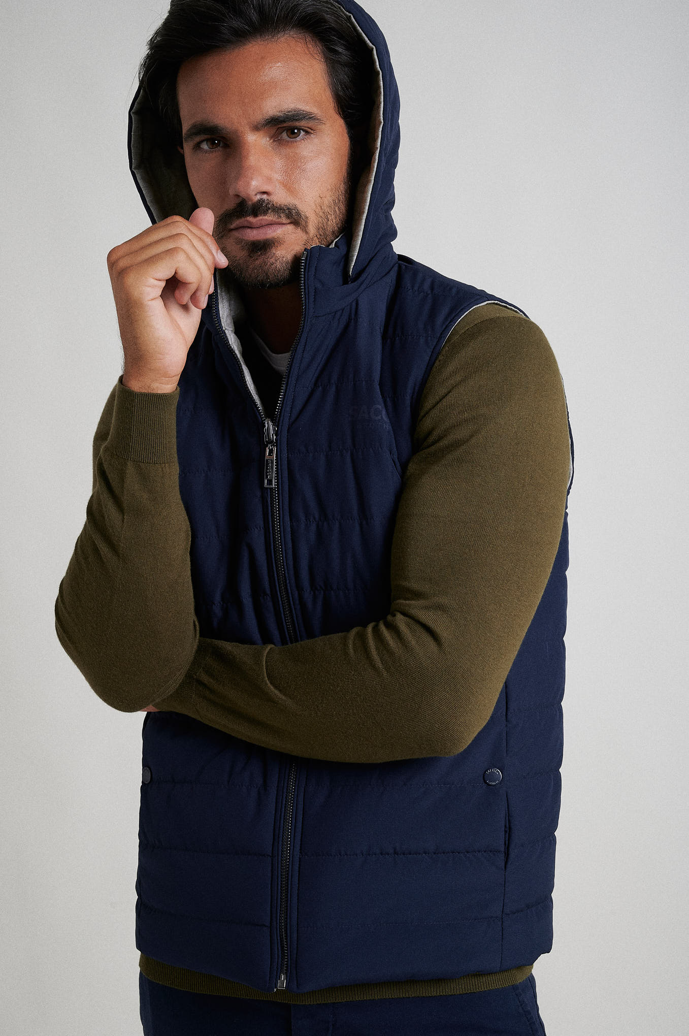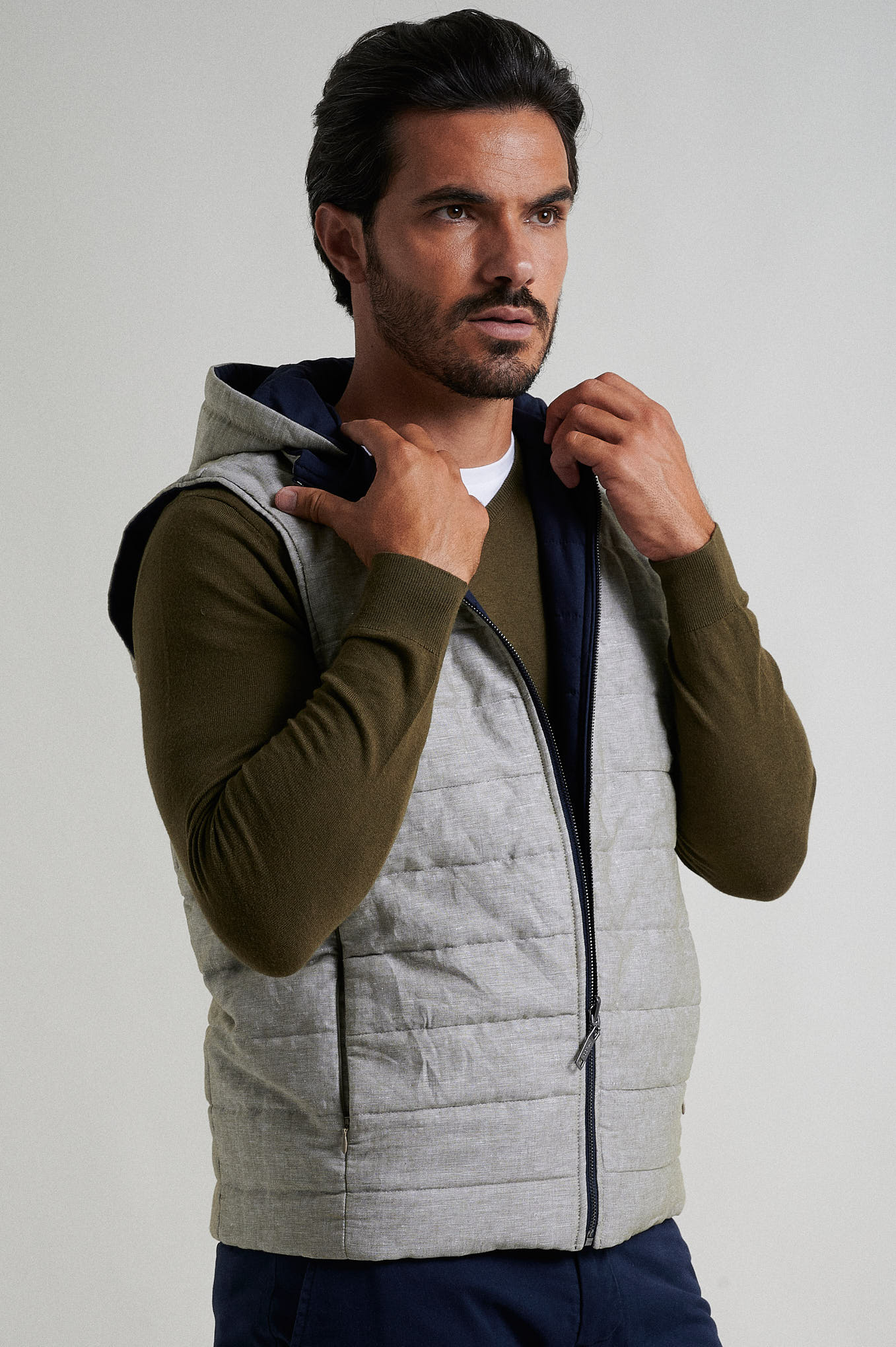 We believe true quality should never go out of fashion, which is why the main fabric of this vest is 100% recycled. Around 35 to 40 plastic bottles are recycled to produce this garment. Dark blue and khaki quilted reversible vest made of 100% recycled polyester and 58% linen 42% cotton. Removable hood. Features zipper fastening on front with personalized puller. Brand new personalized print on chest. This Respekt item is one step towards our commitment for a sustainable world.