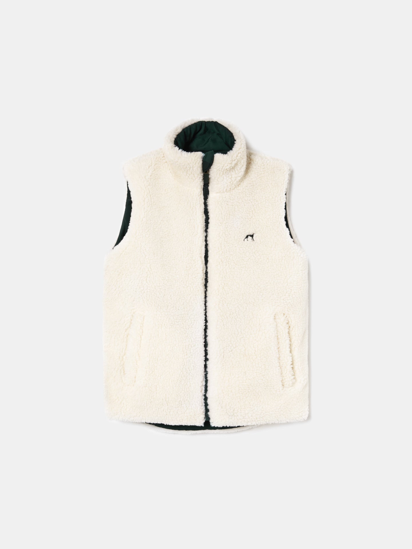 Reversible quilted waist coat for boys, one side fur, one side waterproof fabric. Features raised collar, zipper fastening in matching colour and side zipped pockets. Long sleeves and bottom with elastic binding in matching colour. Rich details such as logo embroidery in contrast colour.