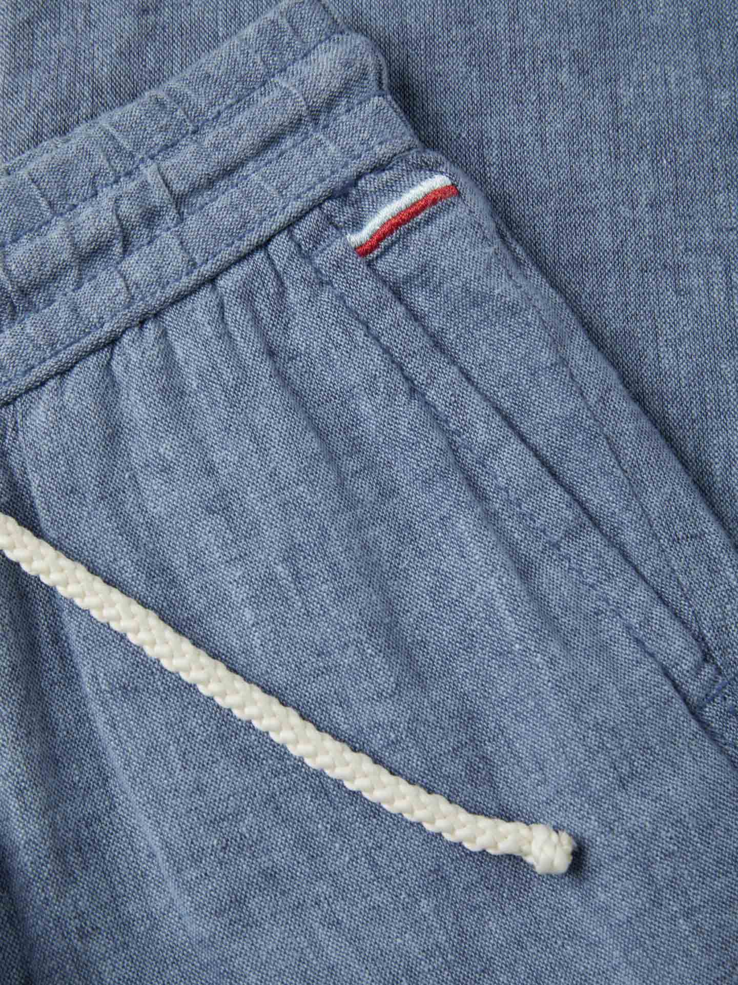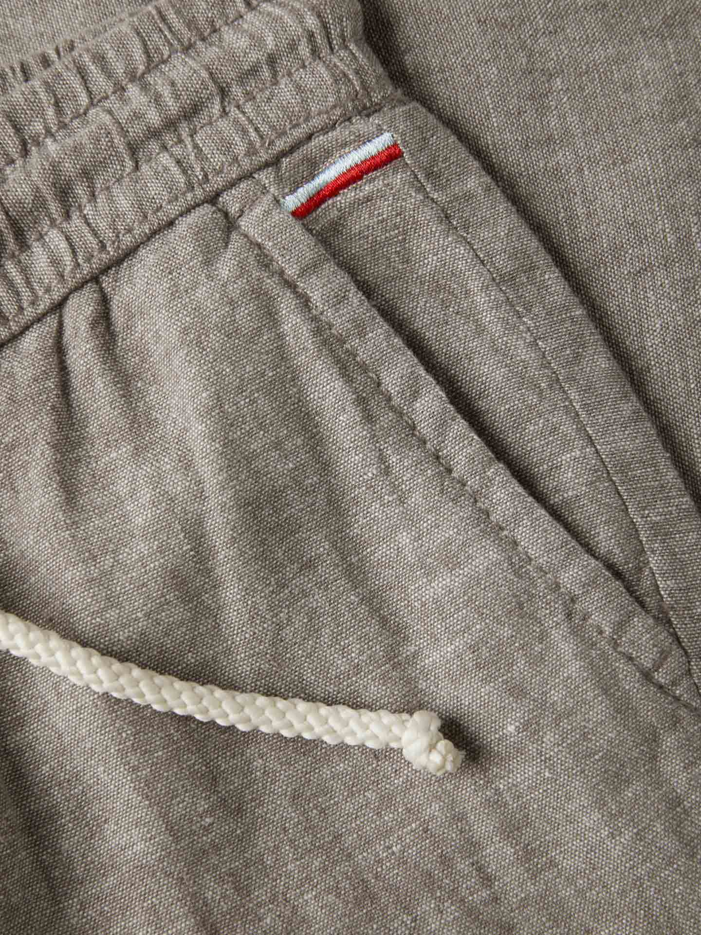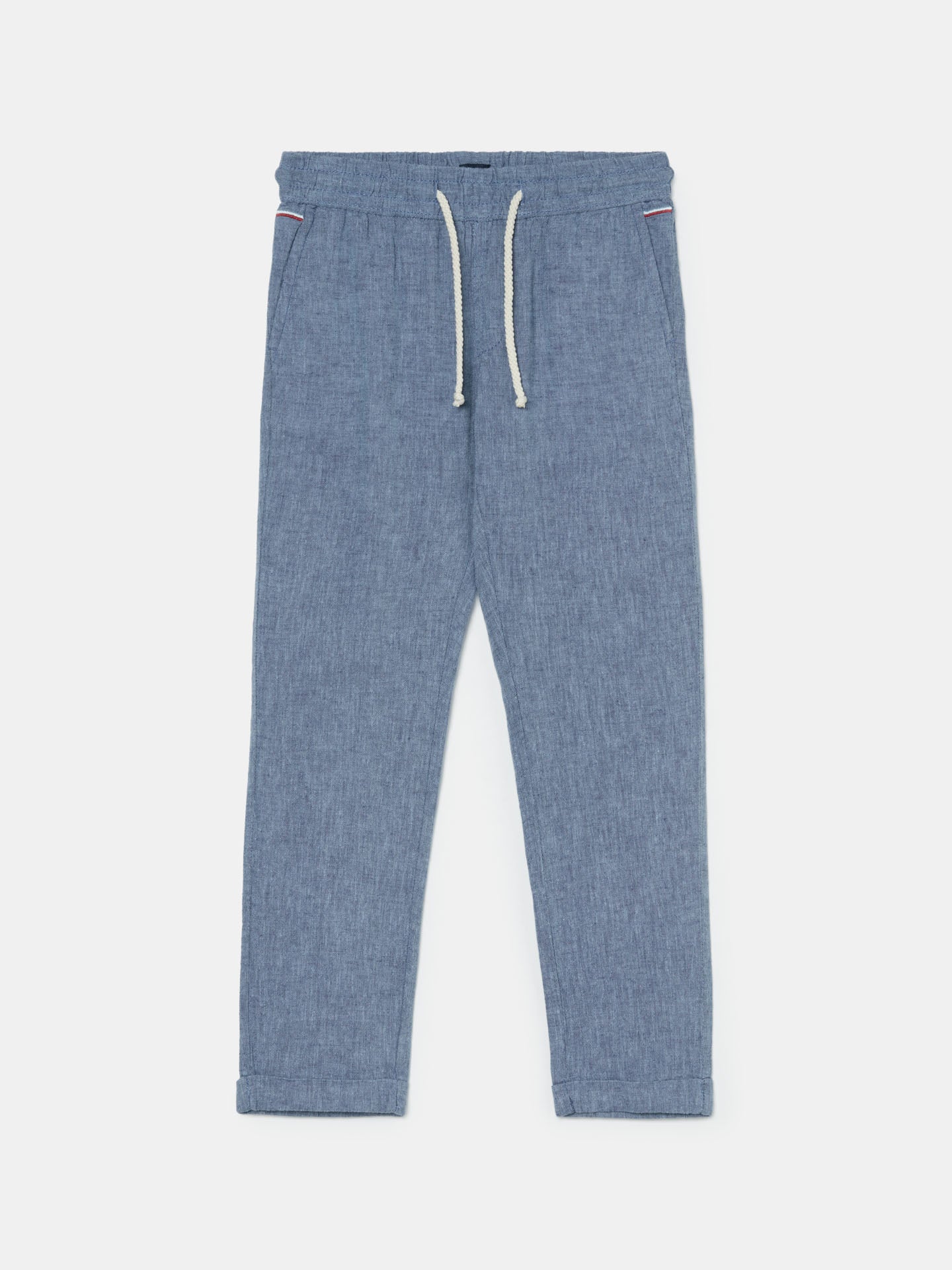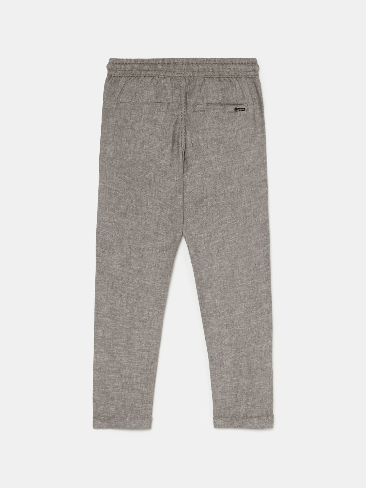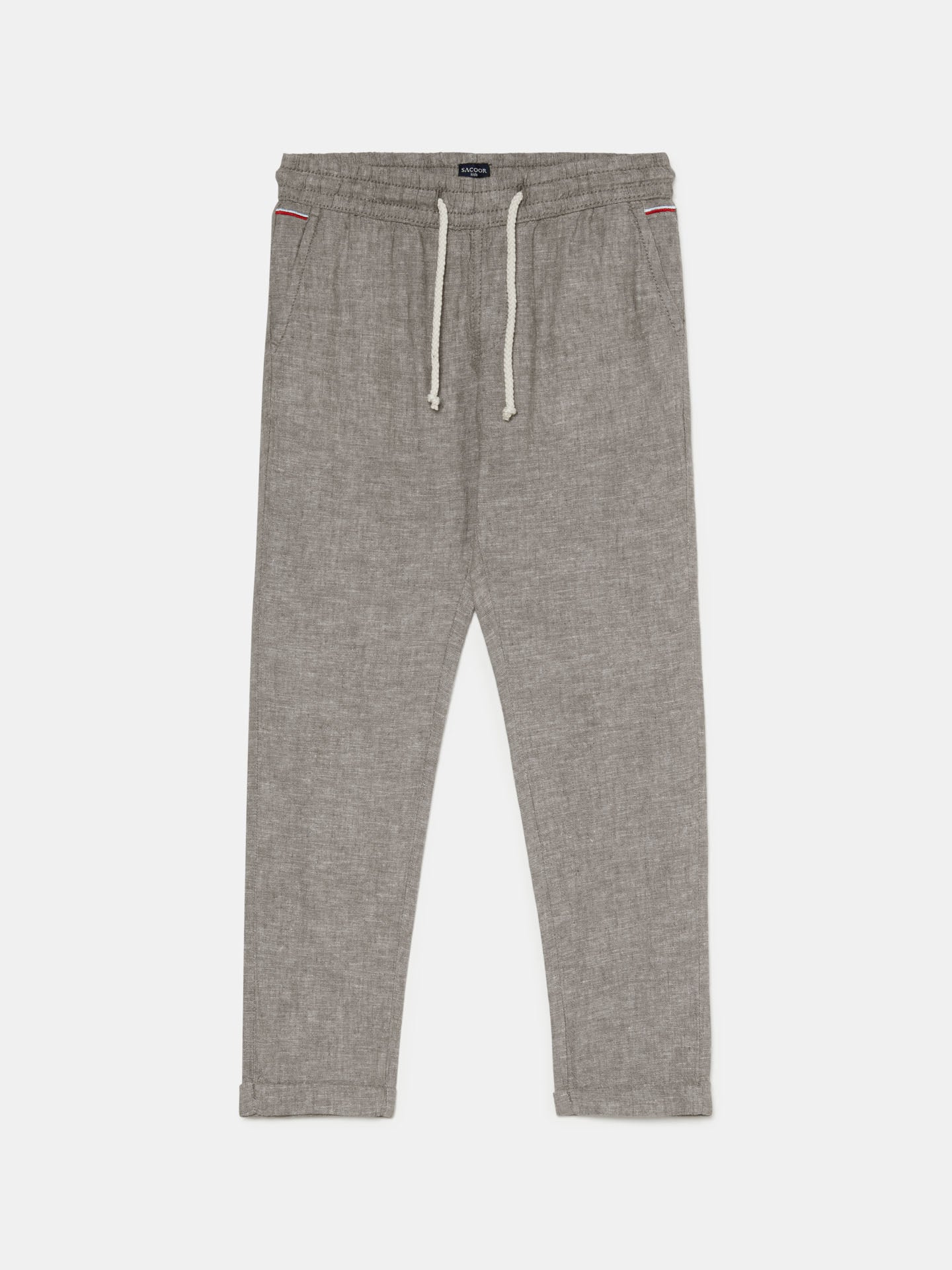 Plain colour chino trousers in Cotton Linen fabric. Elasticated slip-on waistband with adjusting cotton cord for a relaxed and comfortable fit. It features slash pockets at ffront and welt pockets on the back with Sacoor Flag Label. Rich details such as contrast embroidery stripes on the ffront pockets.