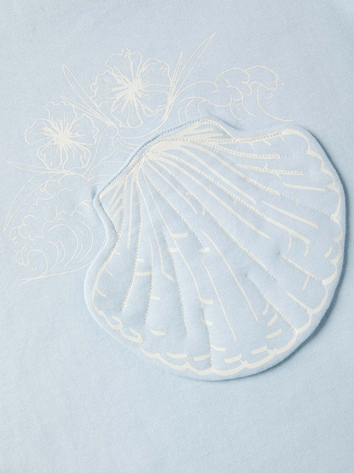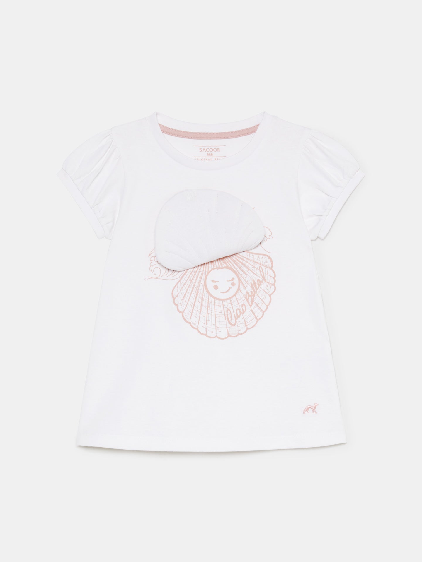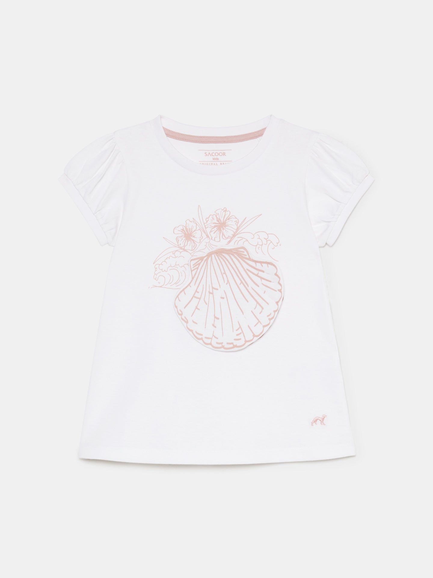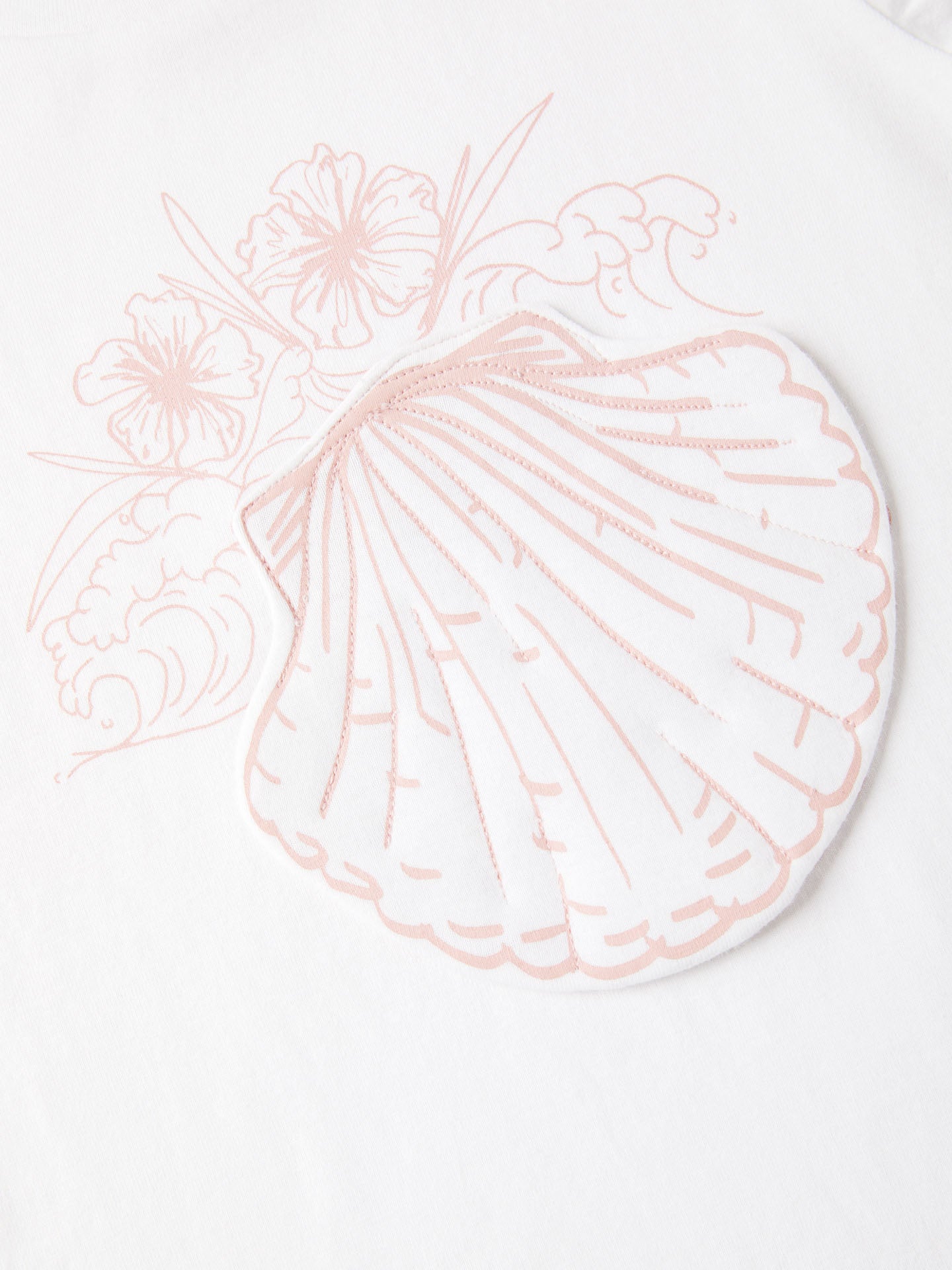 Plain colour T-shirt made from 100% cotton jersey with surprise shell print, open your shell to discover the print. Round rib neckline and short ballon sleeves with rib cuffs . Rich details such as logo embroidery.