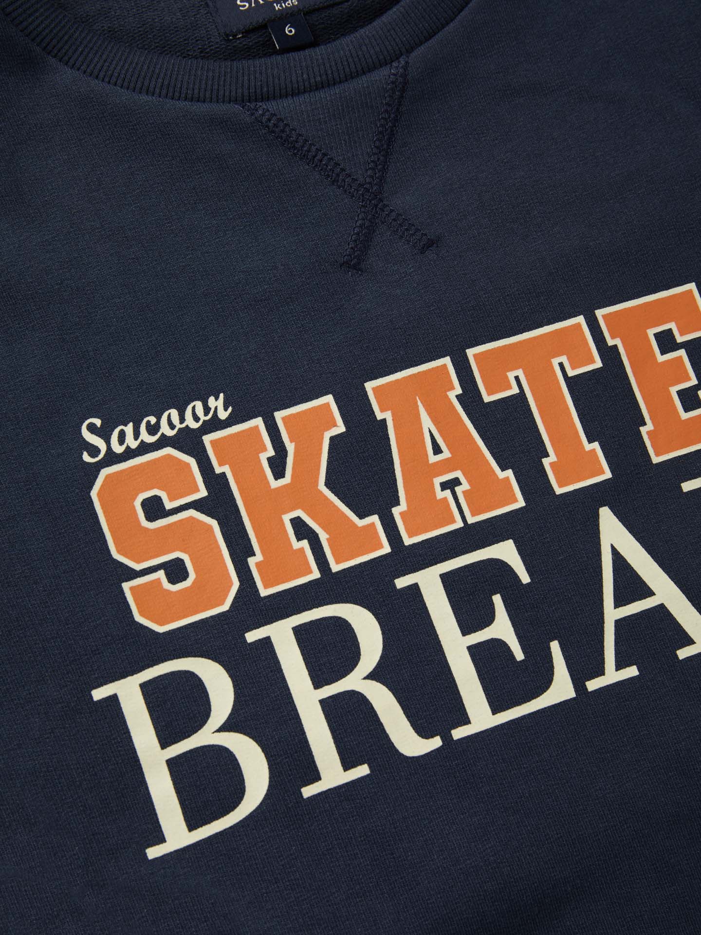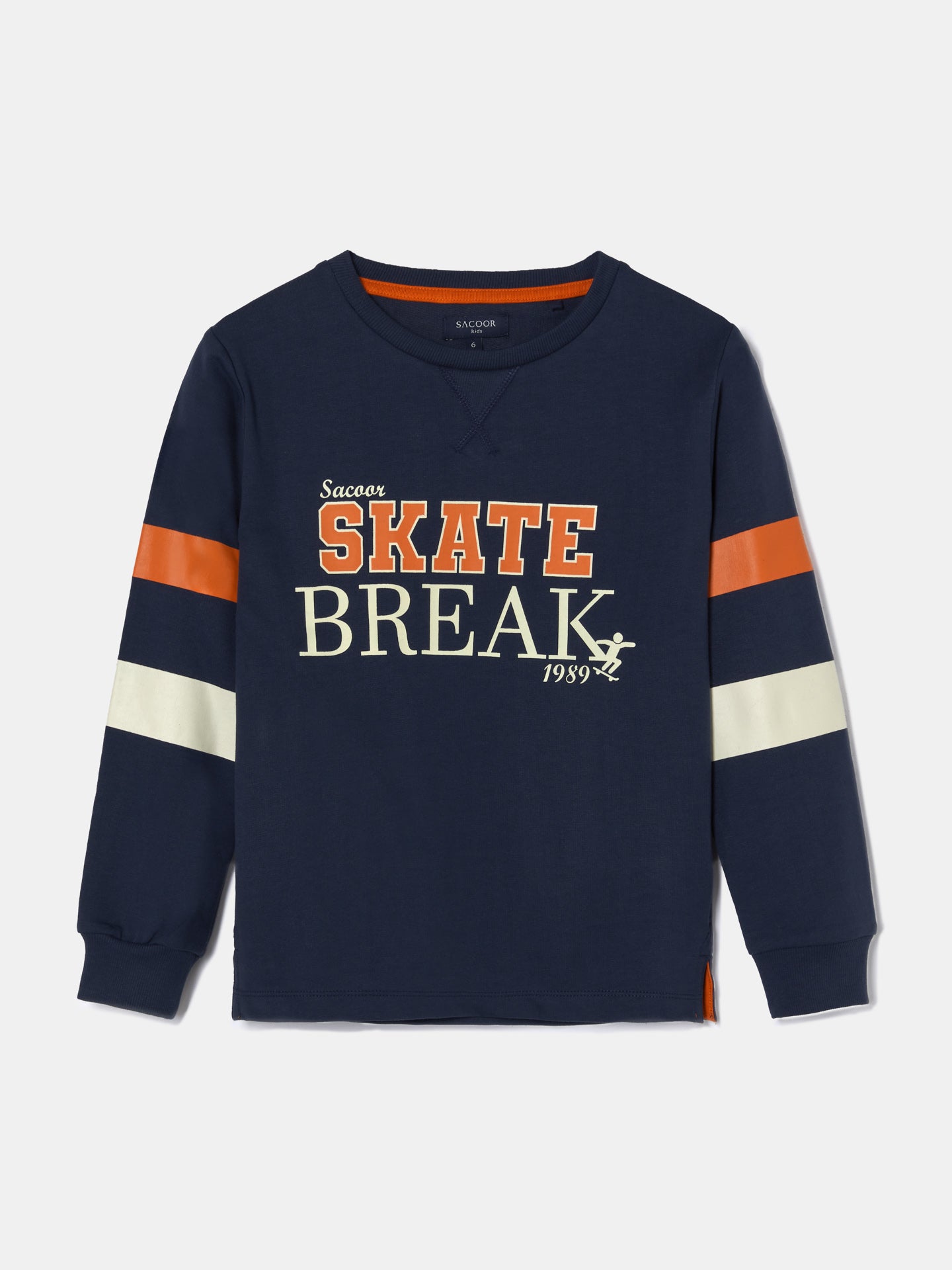 Plain colour regular fit sweatshirt with Skate Break print at front and contrast colour printed stripes on the sleeves. Round neckline and long sleeves finished with rib.