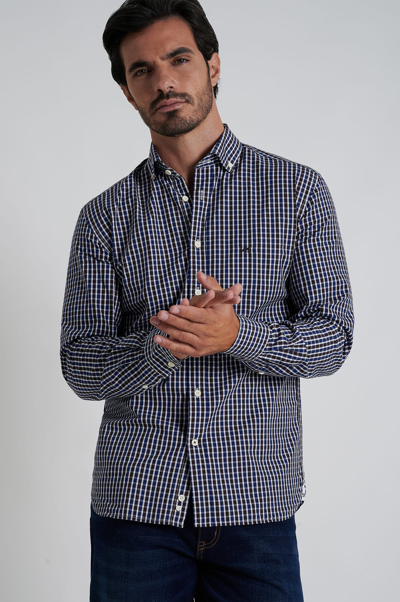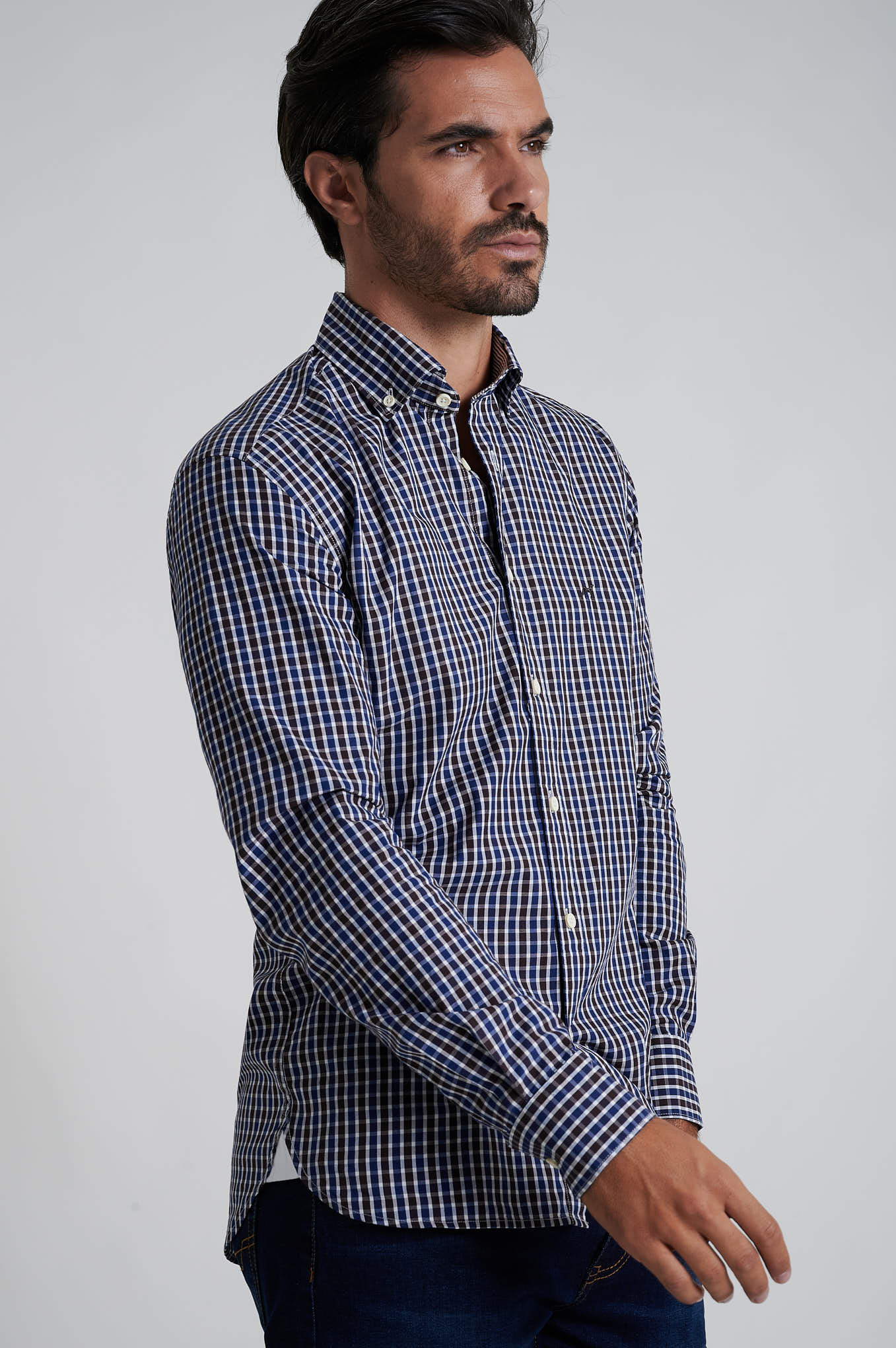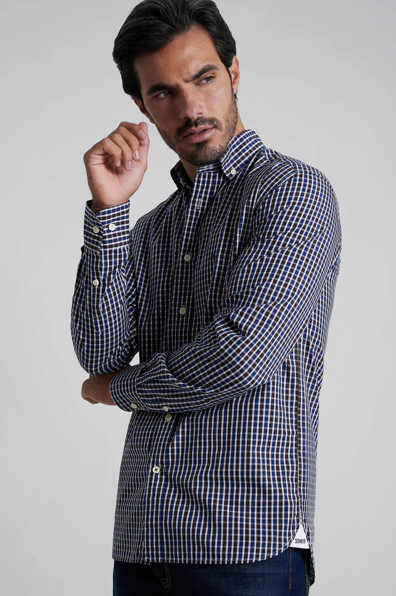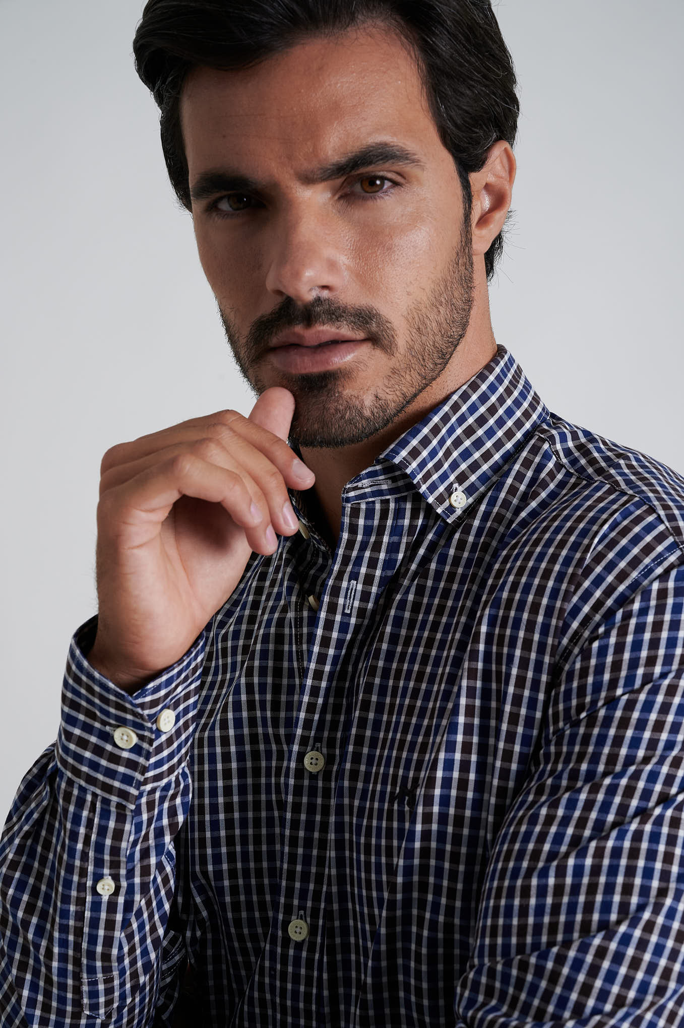 Men's checkered shirt in 100% cotton. Open collar with buttons, including on the back. Contrast fabric inside the collar. Embroidered Sacoor logo on the chest. English seams, more comfortable and for a quality finish. Lateral reinforcement of triangle seams. Relaxed model for use on various occasions with a sporty touch. Available at Sacoor Brothers online store. The back length in size 40 is 78 cm and the sleeve length is 66 cm. See our Size Guide.