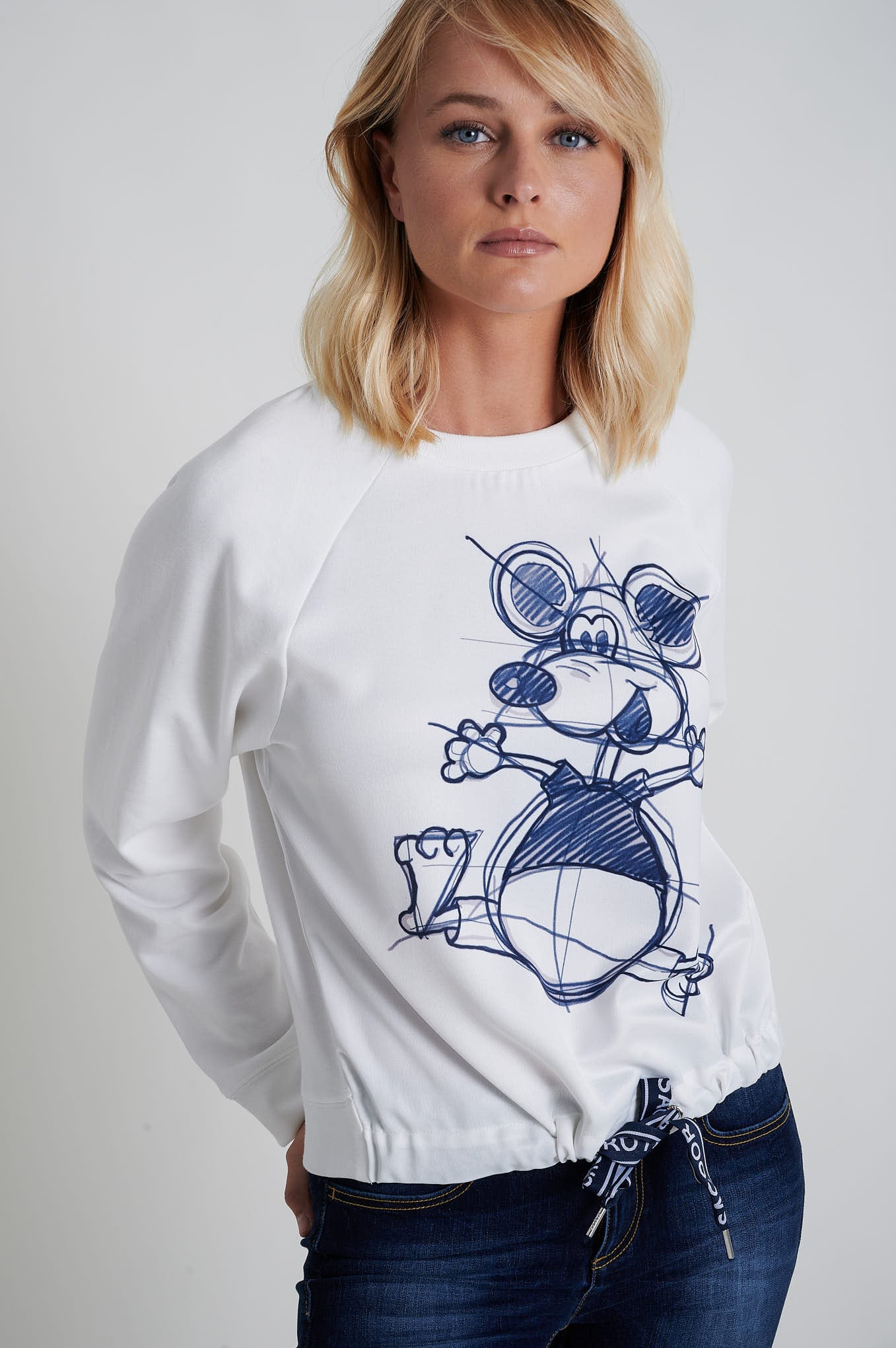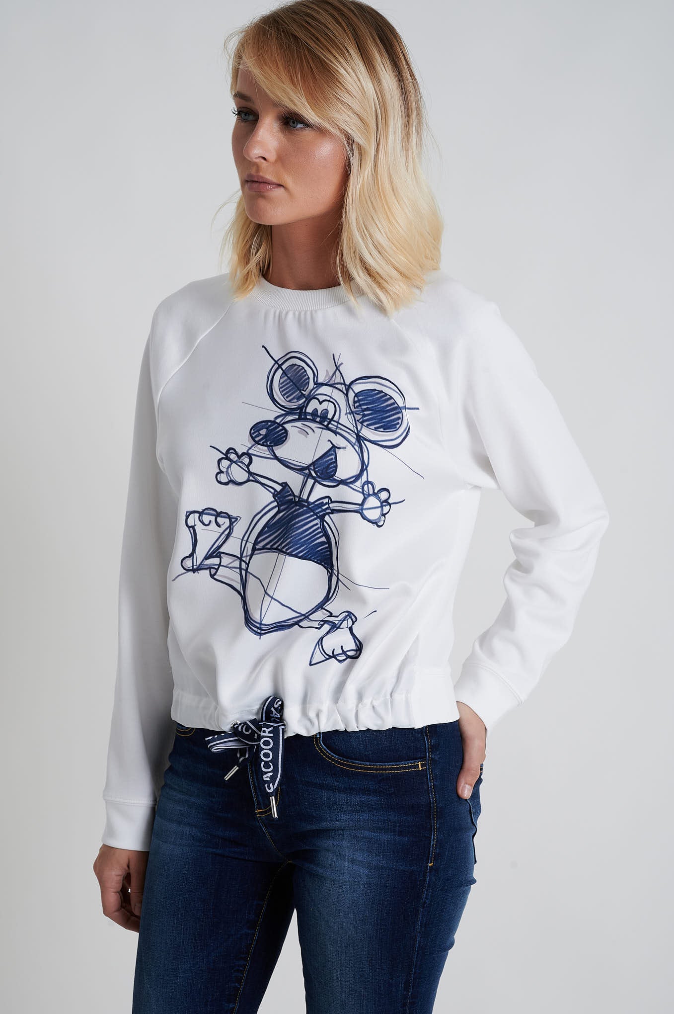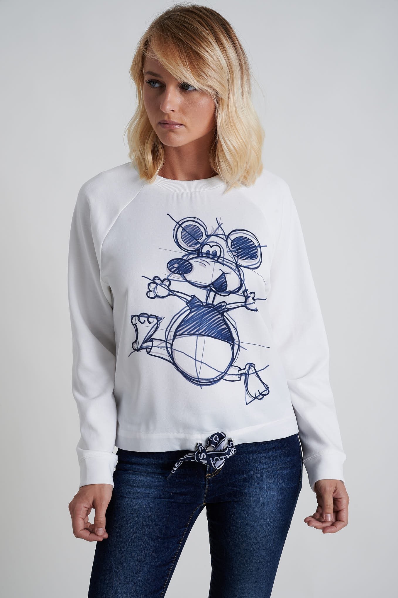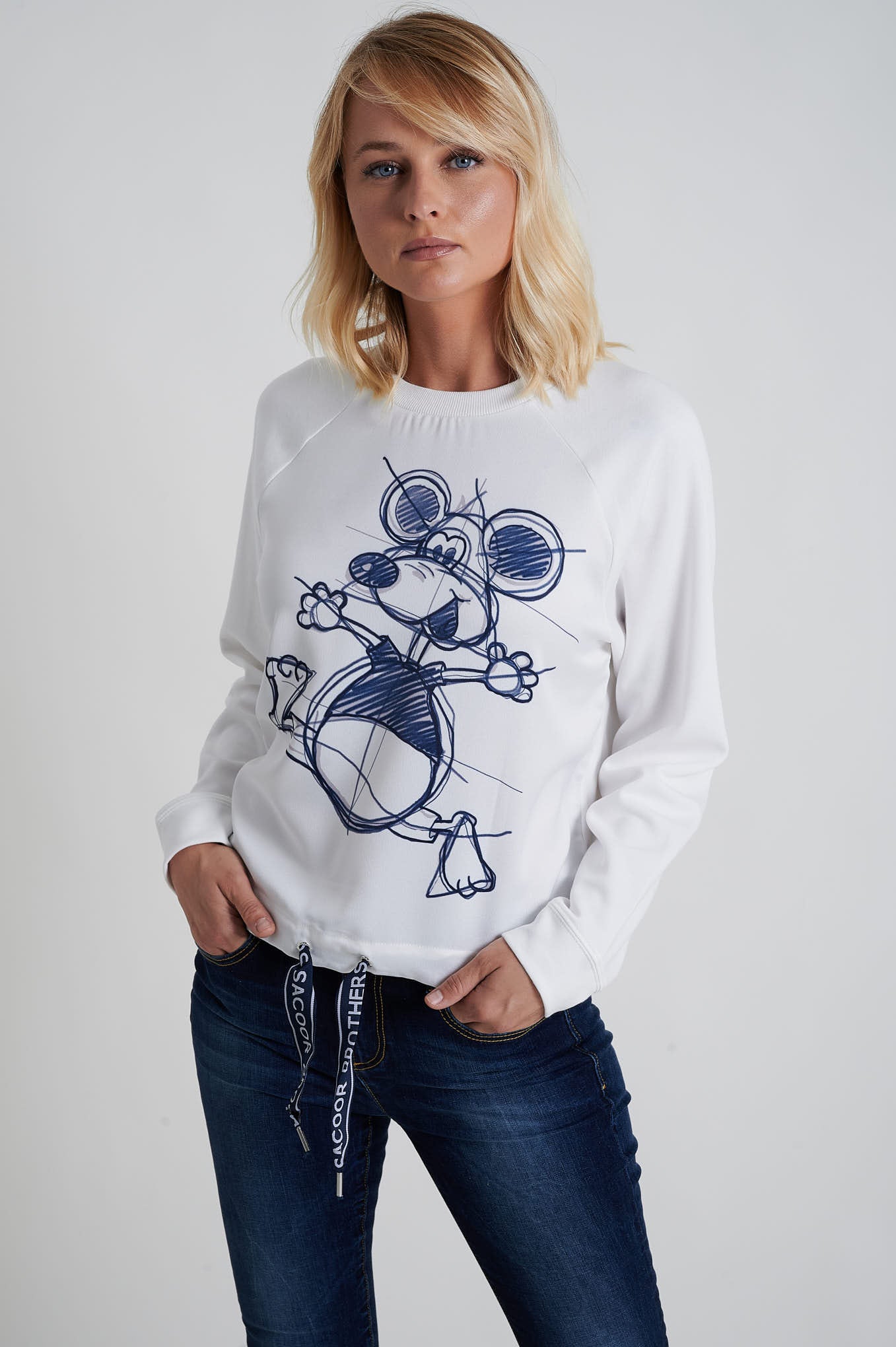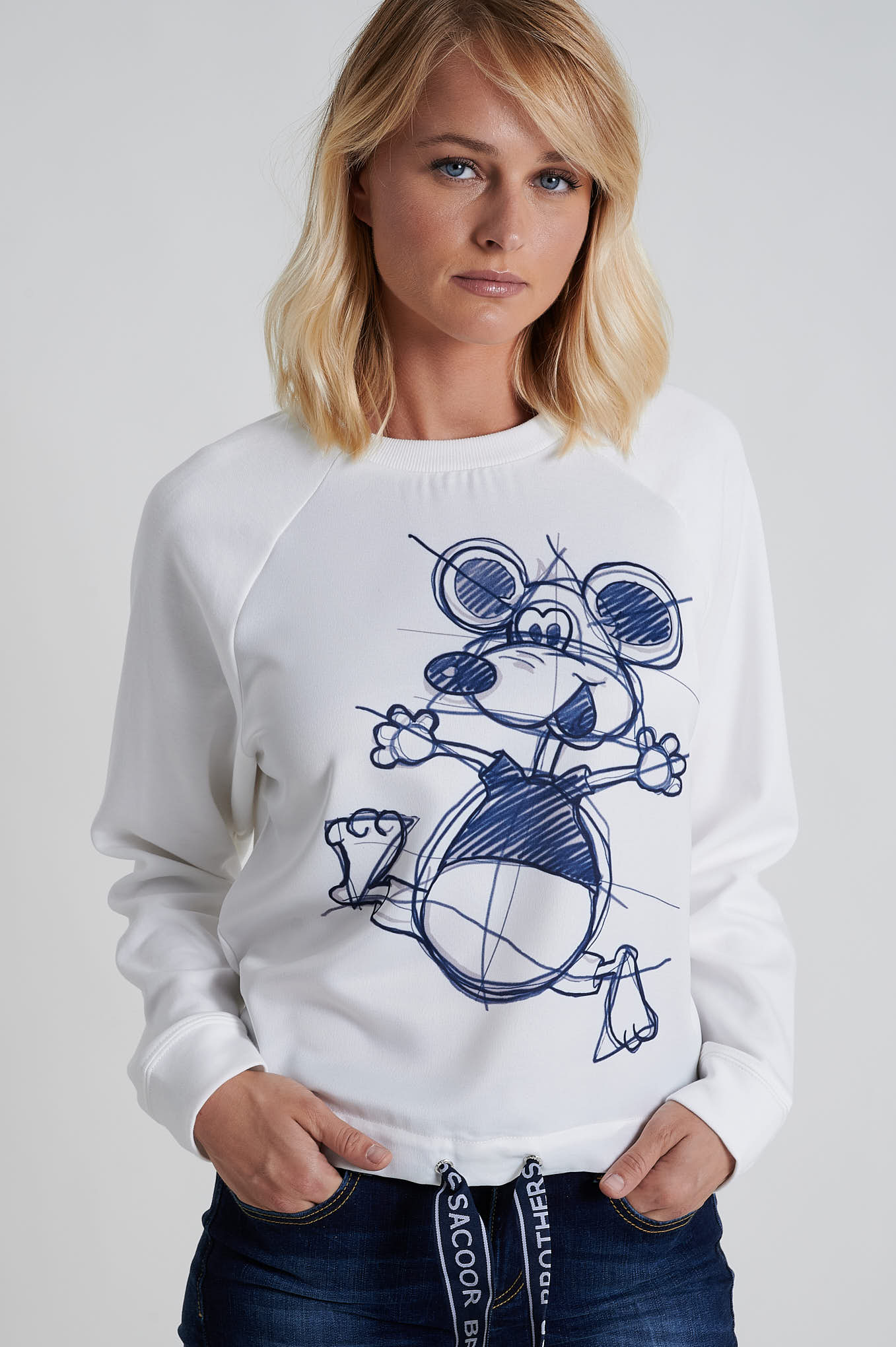 Loose fit sweatshirt made from 100% cotton fabric. Features a front print with the Sacoor Mouse, short sleeves with single stitch hem finishing and bottom with double-needle stitch.