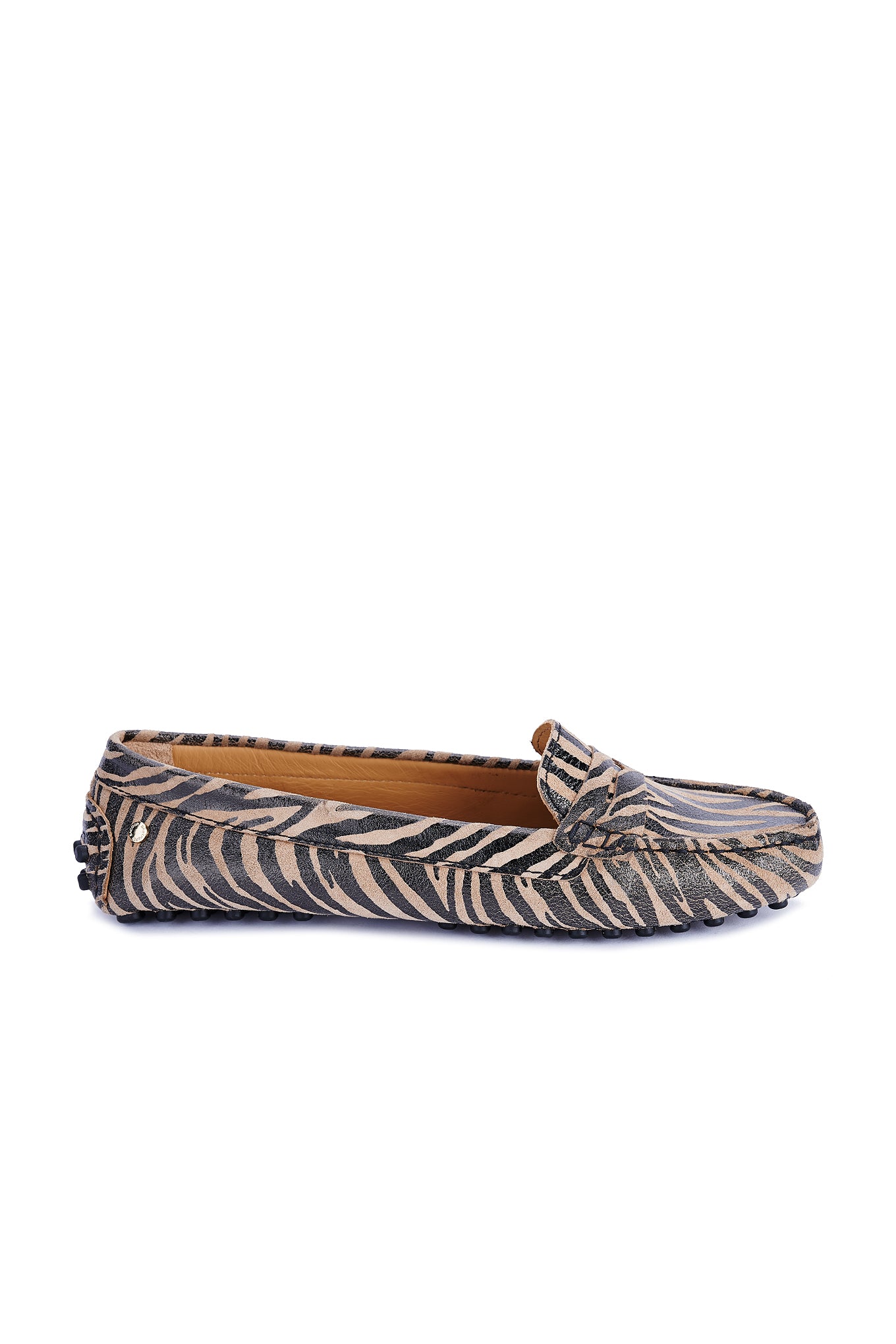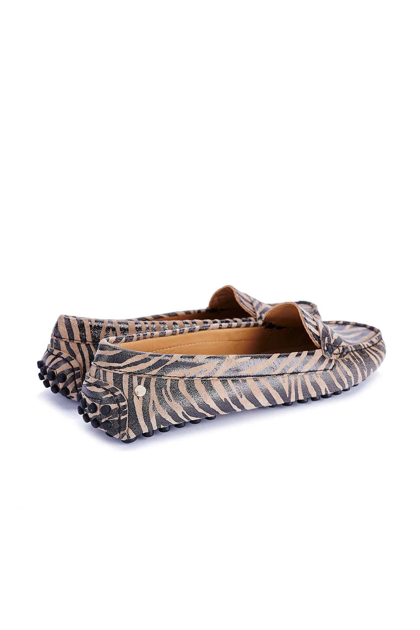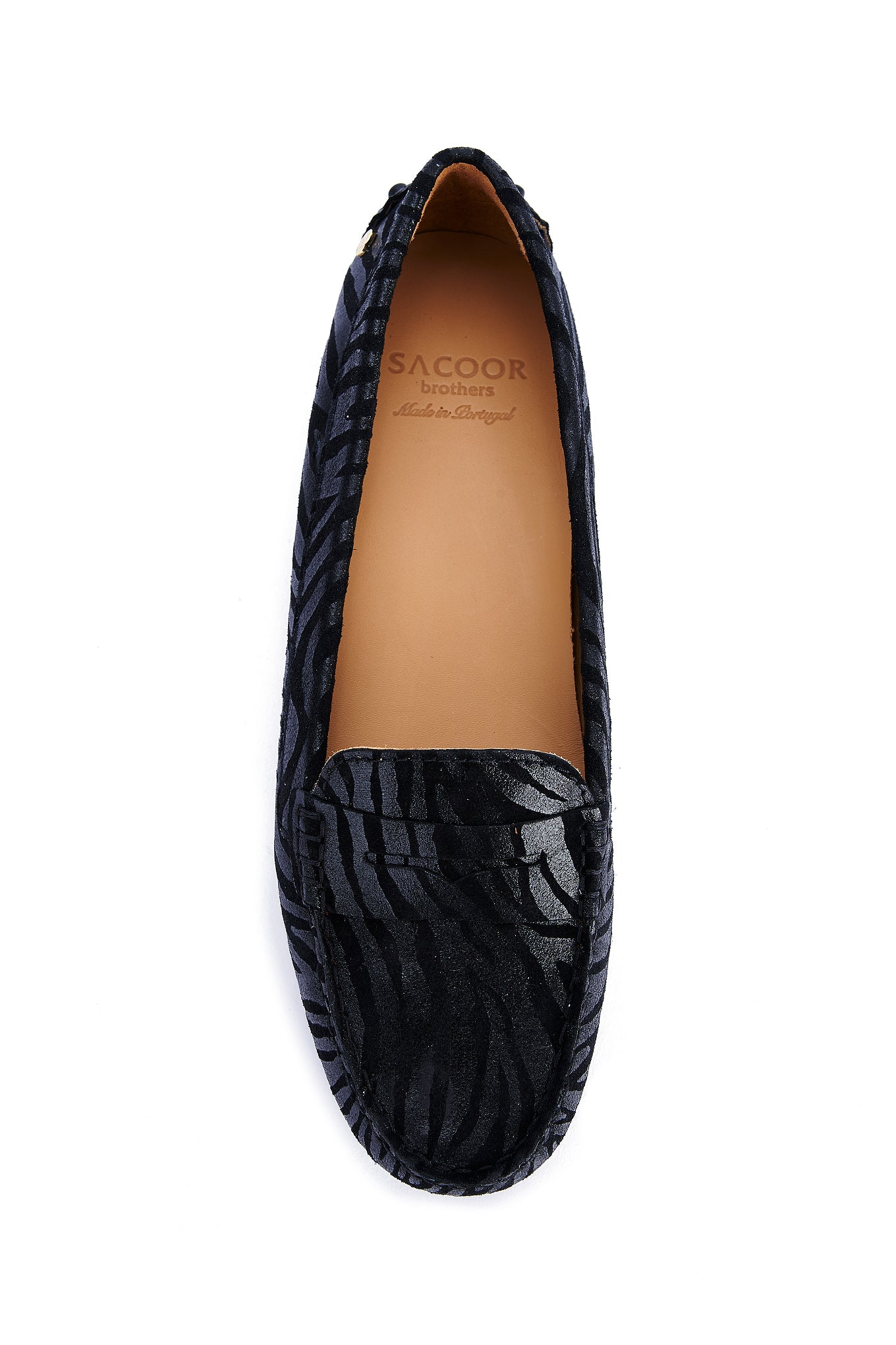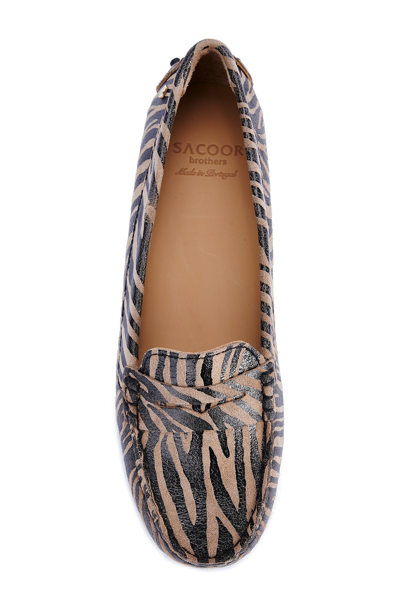 Women's animal print suede shoes, a season trend. Made in Portugal. On top they reproduce the well-known moccasin design. Leather lining interior, with ultra-comfortable insoles. Rubber sole, with heel detail in the same material. Elegant customised Sacoor storage bag included. Original, elegant and comfortable!