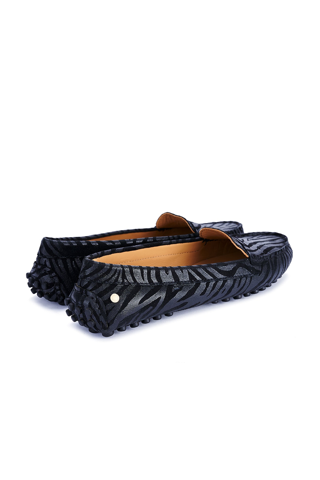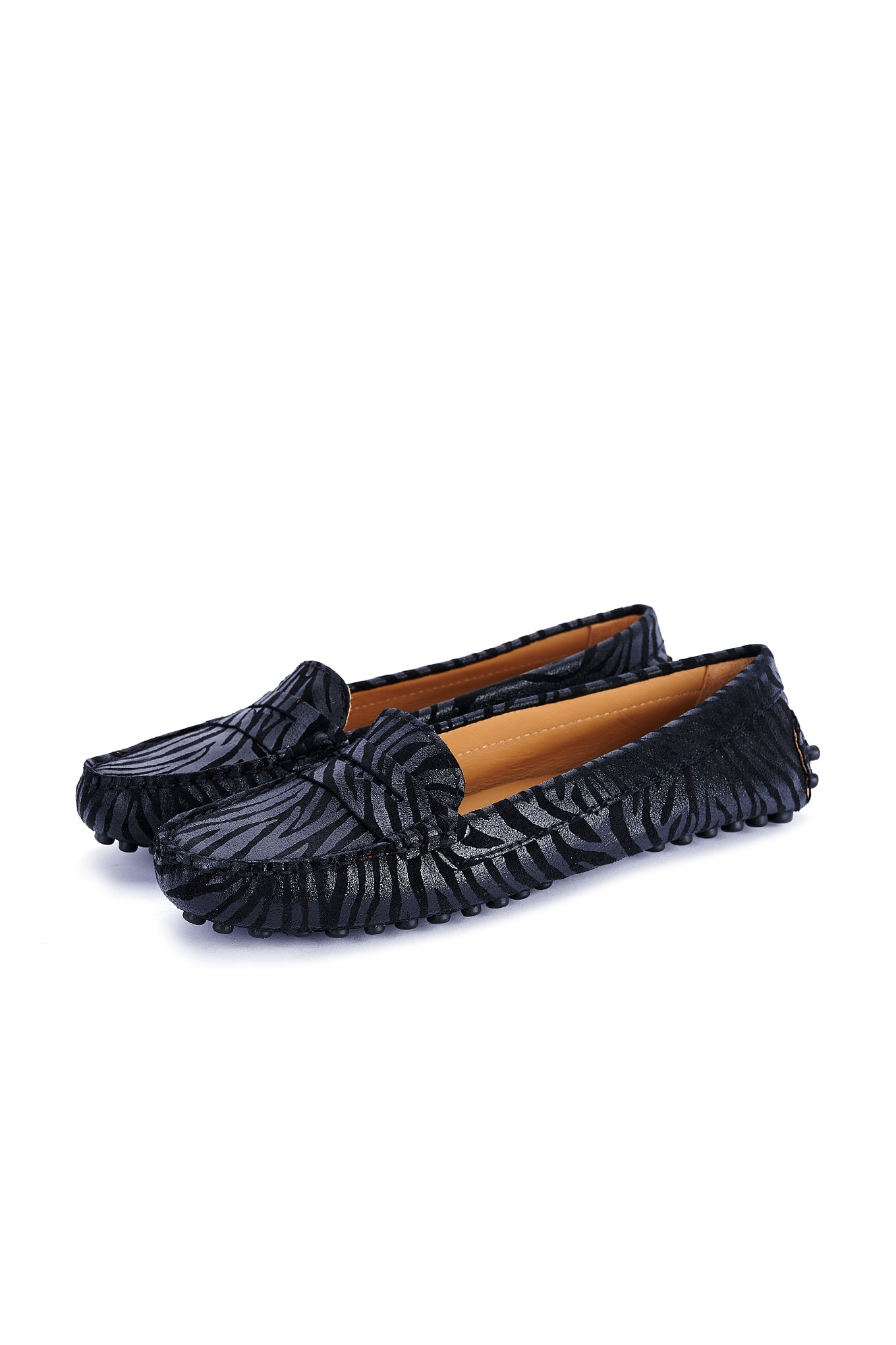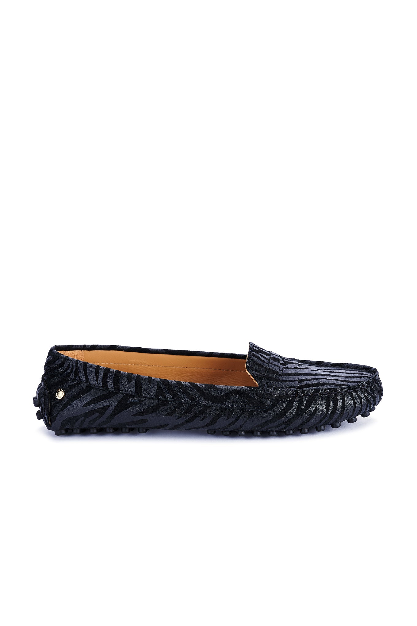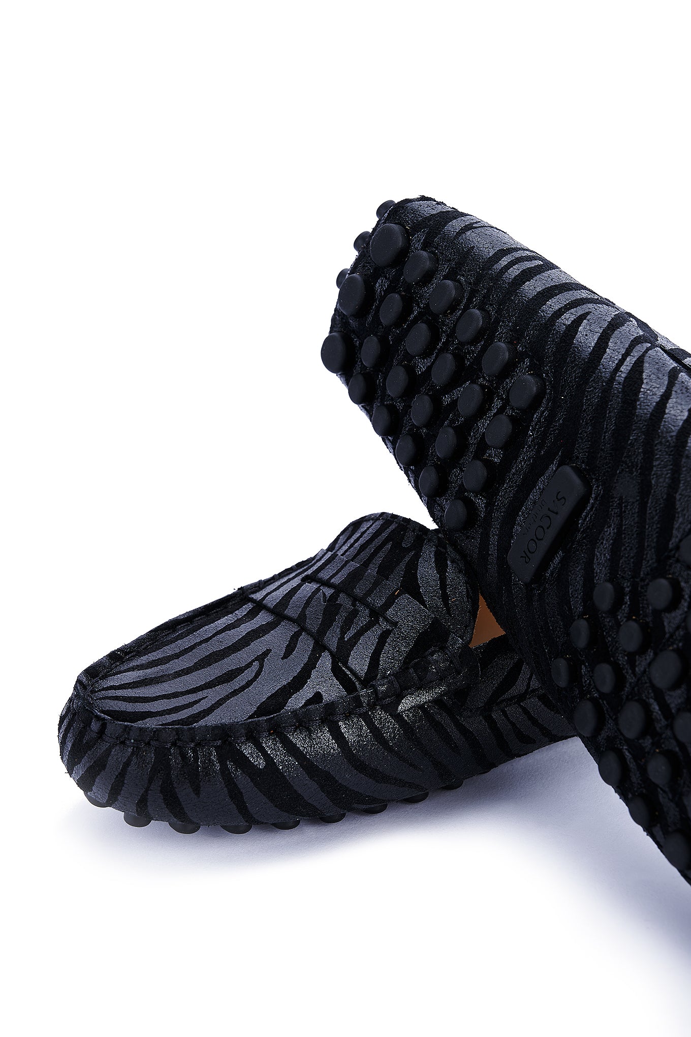 Women's animal print suede shoes, a season trend. Made in Portugal. On top they reproduce the well-known moccasin design. Leather lining interior, with ultra-comfortable insoles. Rubber sole, with heel detail in the same material. Elegant customised Sacoor storage bag included. Original, elegant and comfortable!