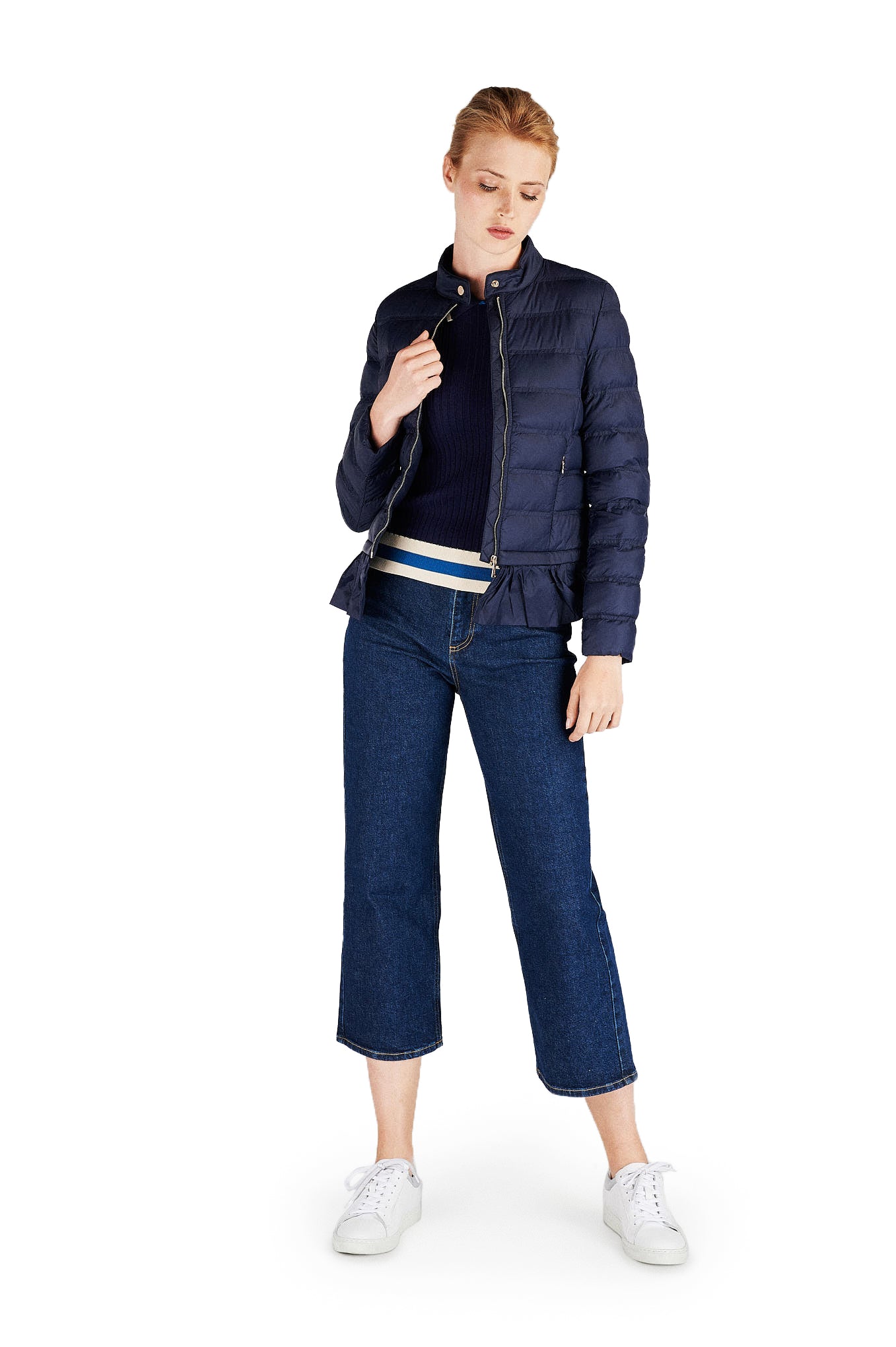 Women's padded jacket, following the trends for the new season. Plain, very light, ideal for cold and rainy days. Raised collar with press button. Side pockets with zip hidden. At the base, it has a ruffled that gives it a feminine touch and is removable. Interior with 1 pocket with zip. Close with zip. An "Ultra Light Down" edition piece that, because of its lightness, can be stored in a bag (included).
