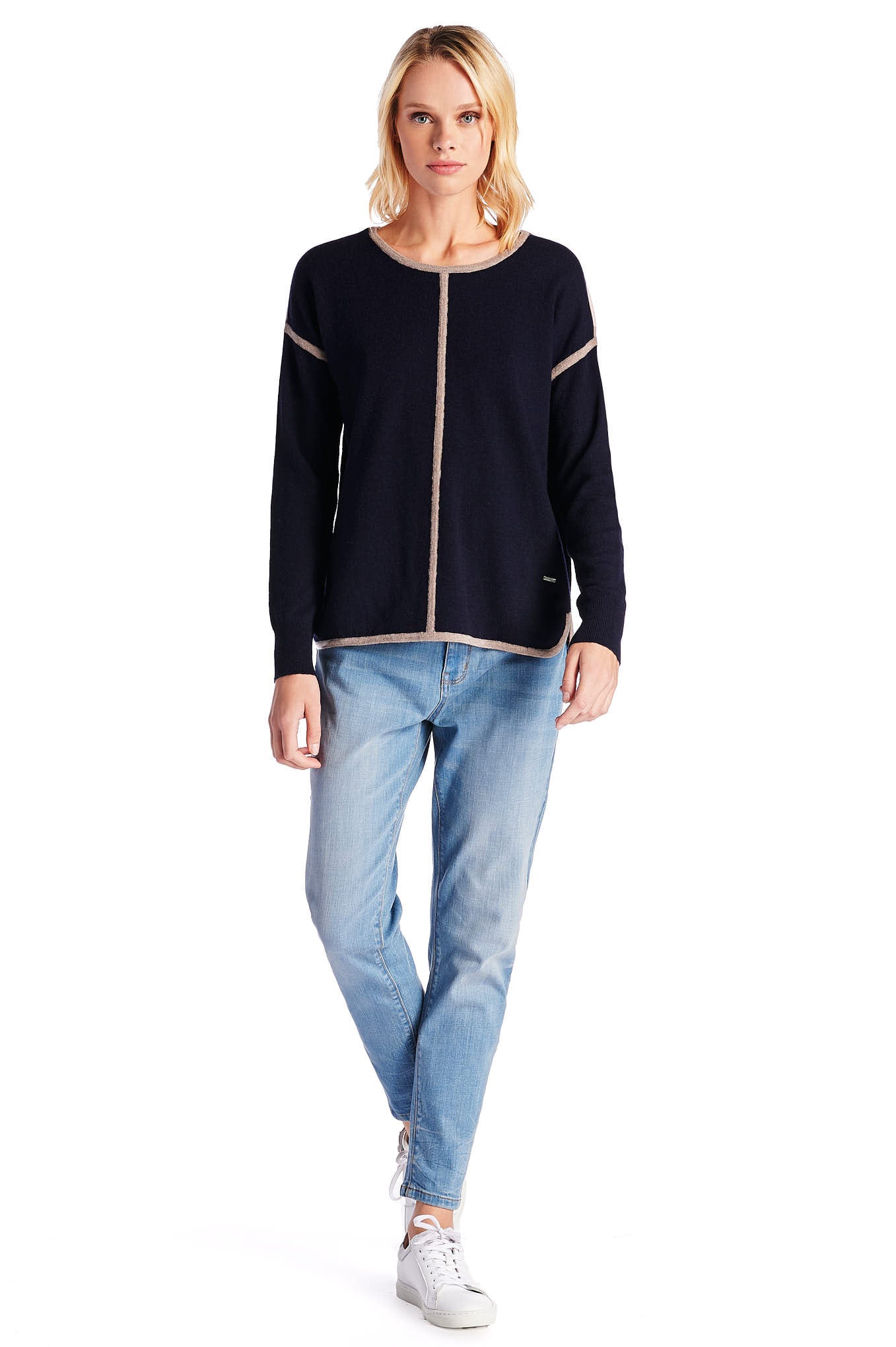 Women's knittes sweater, cozy and warm in woolen fabric. Loose model, slightly longer back. Plain mesh with bright shoulders, sleeves, neckline, base and front. Rounded neckline . Ribbed finishes on sleeves cuffs. Set of mesh 7-9, intermediate. Brand customized plate at the base of the knitted sweater. Collection Autumn / Winter 2019 is available in the online store Sacoor Brothers.