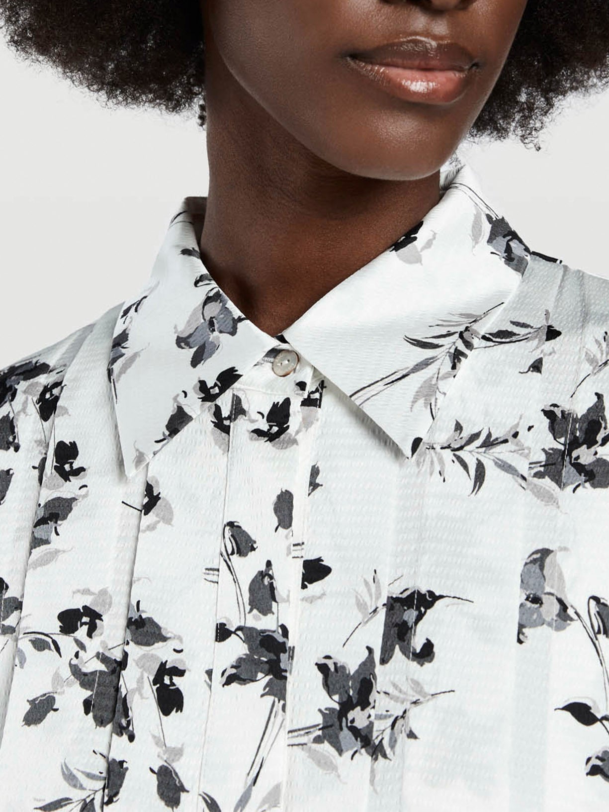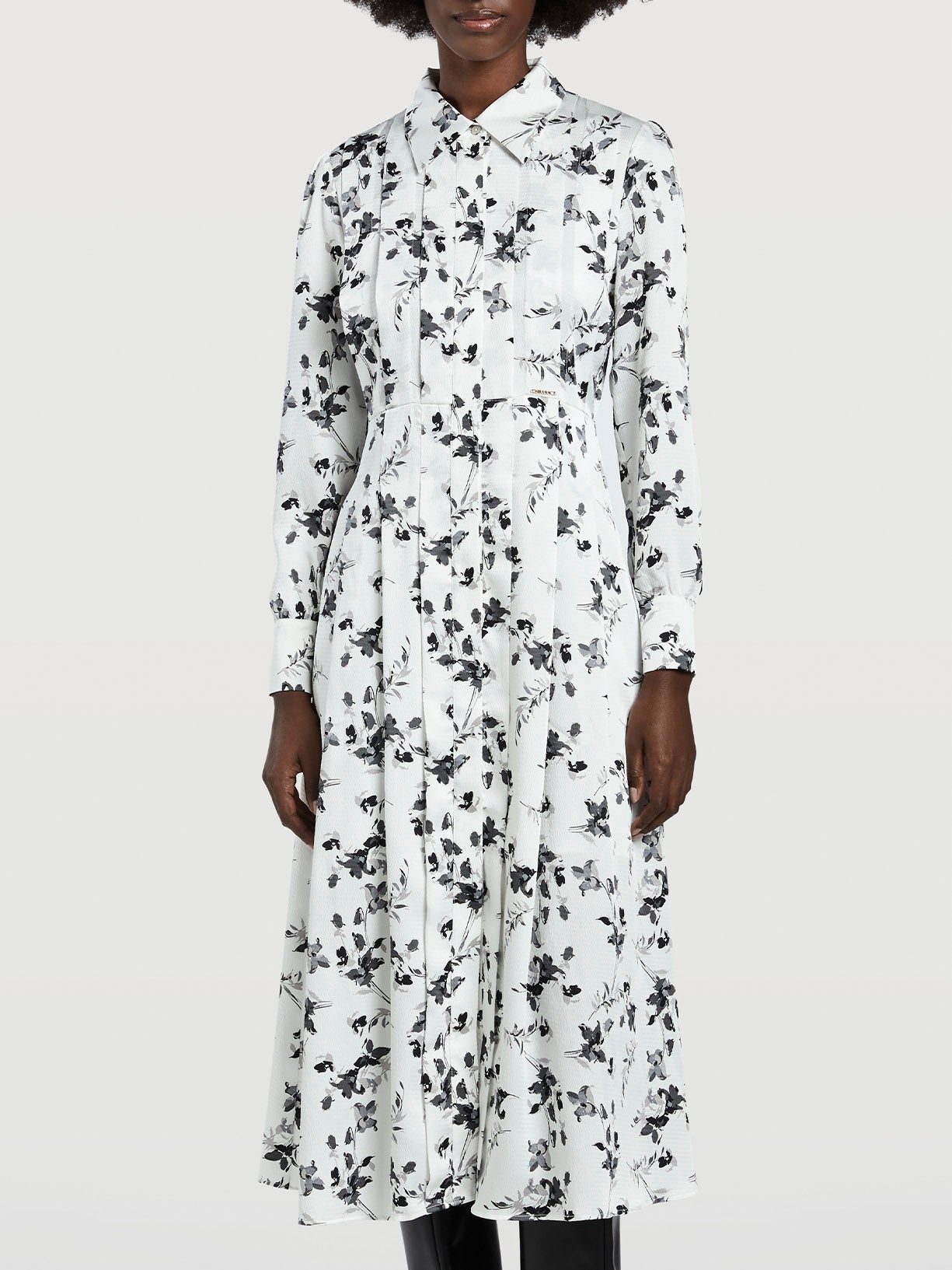 Long dress with all-over flower print. Features pleats at front and back, wide collar and placket with hidden buttons. Long sleeves with one button cuffs and cinched waist. Brand metal plate at the front.
