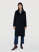 Long wool blend overcoat. Featuring a slightly loose fit, peaked lapel and button fastening through double-breasted front. Flap pockets at side and long sleeves.