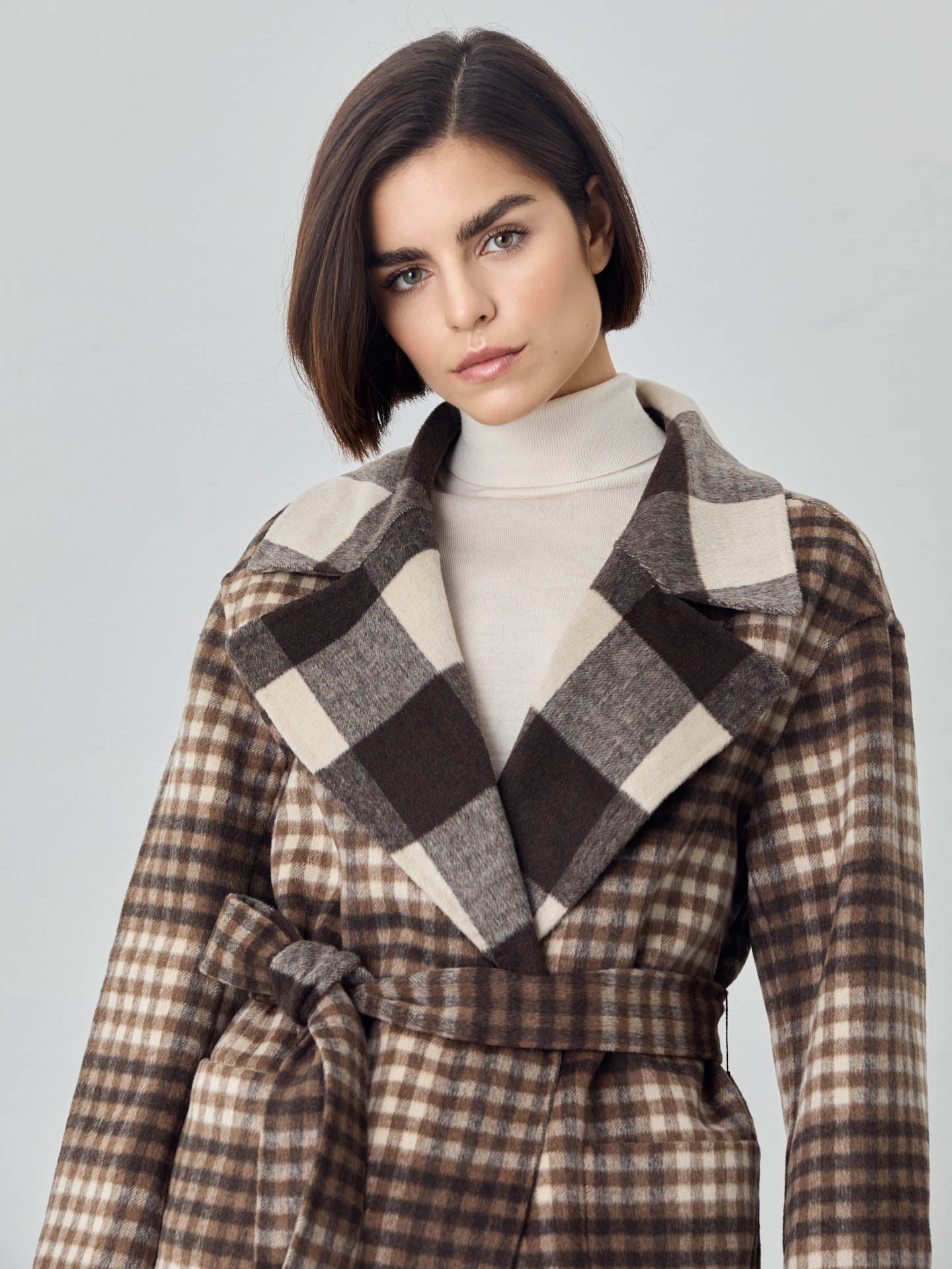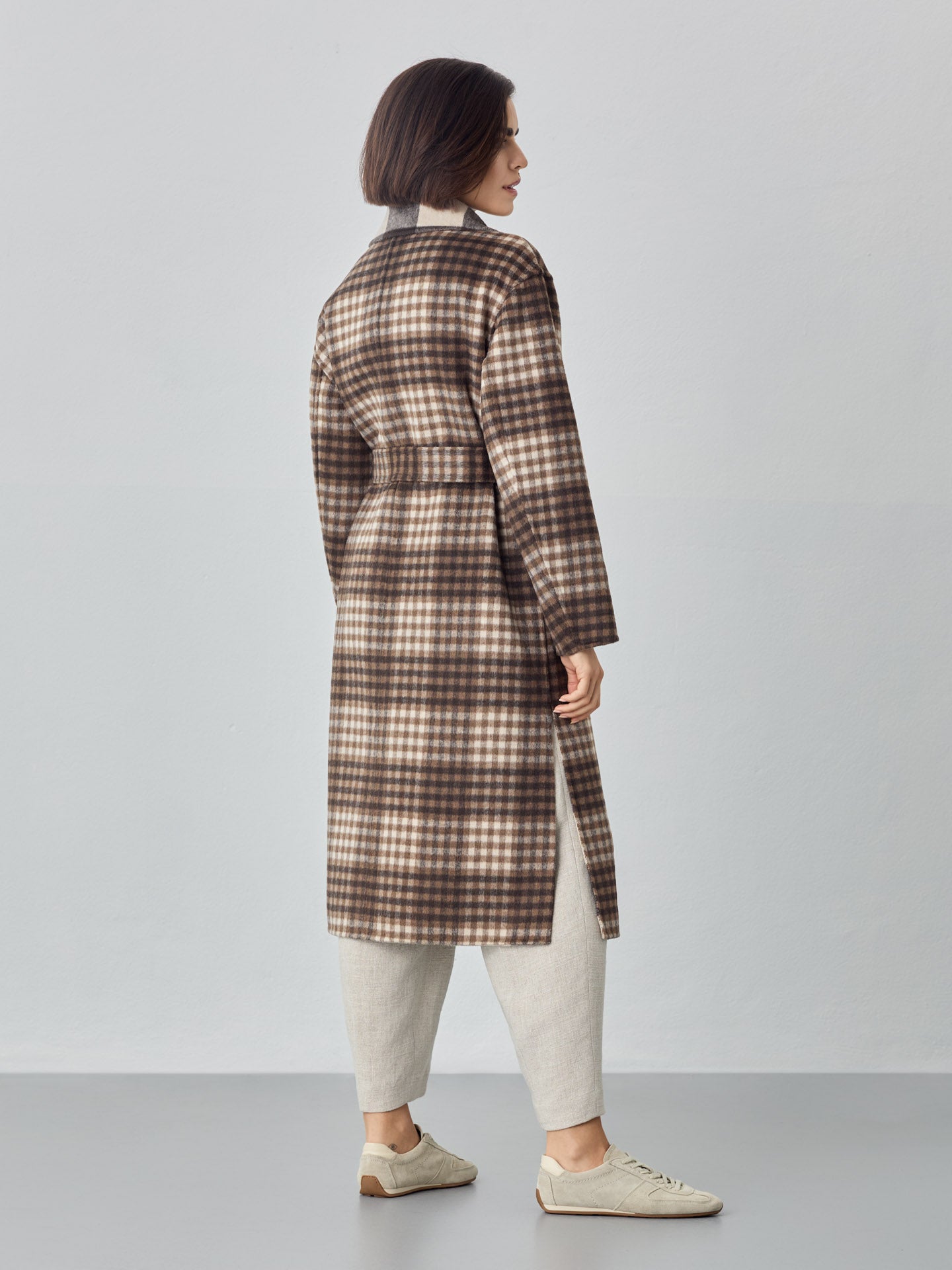 Reversible checked long overcoat. Featuring a loose fit with a removable tie belt to cinch in the waist, big patch pockets on both sides of the coat, and side vents for more mobility.