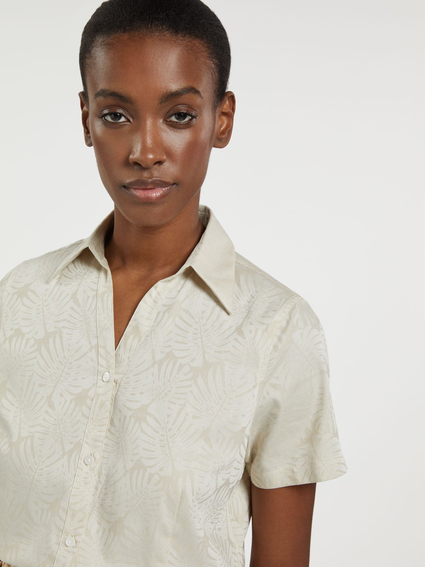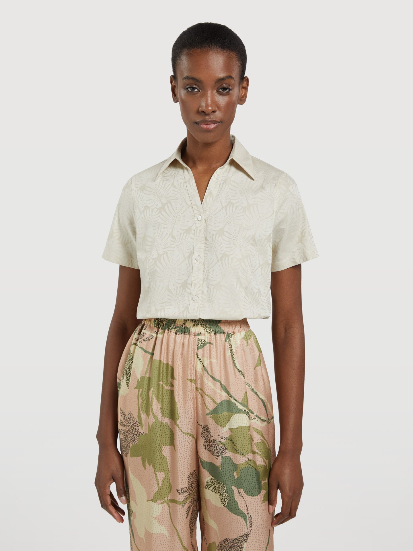 Classic all-over print shirt made of high-quality fabric. This slim fit shirt features a small collar, 'V' open neckline, hidden placket, voluminous elbow length sleeve and rounded hem. With brand metal plate at the back.